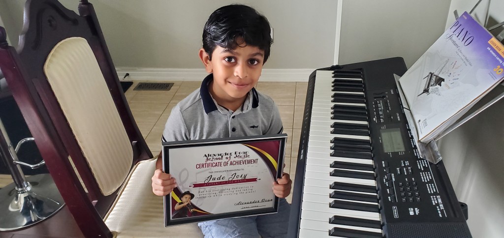 Jude received his framed Student Of The Month certificate, and is featured in the month’s newsletter as well as on our Facebook and Twitter pages, and on the school website when the newsletter is posted there.